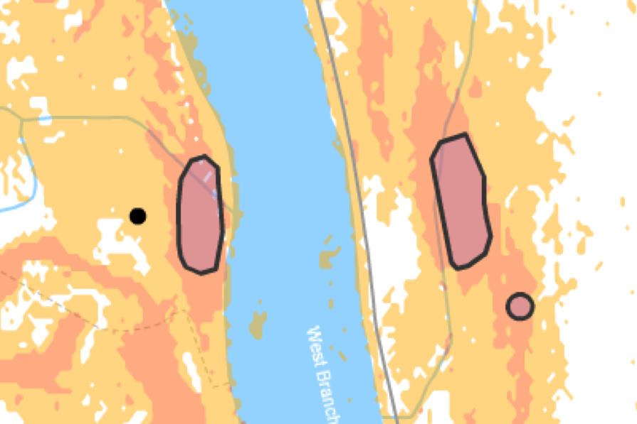 - Uneven survey across the state, both by setting and by region. Some locations are well surveyed (along rivers); some not so much (upper thirds of mountains and hills). Clearly, regions with better data yield better results.