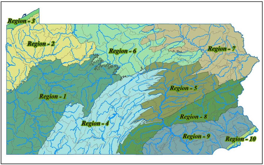 Pennsylvania was divided into 10 geographic regions for the purposes of developing models that responded to local conditions. Within each region, study areas based on watershed and topographic position were created totaling 132 study areas statewide. For each study area, a customized predictive model was created. As with most inductive predictive model development, known archaeological site data was used to build the models. Known archaeological site data was also used to test and further refine the models. Environmental variables were used in the analysis, including distance to 3rdand 4thorder streams, distance to drainage head, nearness to wetlands, slope and average soil water capacity, amongst others. In this instance, the algorithms used were: backwards stepwise logistic regression, multivariate adaptive regression splines (MARS), and random forest (RF).