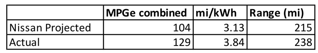 Another way to calculate efficiency is to look at miles per kWh.  The promised efficiency for the Leaf was 100 miles per 32 kWh (3.125 miles/kWh).  Overall, during the course of the year, the battery averaged above what was advertised for the Leaf, 3.84 miles per kWh.  The driving year encompassed 7,258 miles, consuming 1,892 kWh of electricity.  The MPGe (miles per gallon electric equivalency) that was advertised for the Leaf was 114 for city driving and 94 for highway driving.  The combined MPGe for this last year was 129.3, again higher than the claims by Nissan.  (Converting electricity to gallons is done by multiplying each kWh/mile by 33.7.)