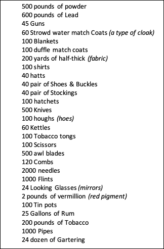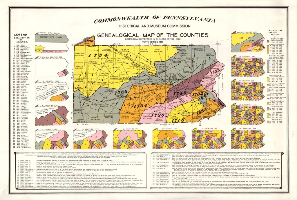 I don’t want to undertake a 12-days of Christmas accounting, but considering that perhaps 2,500,000 acres were transferred (based on a visual of the Genealogical Map, in comparison to the 1,200,000 acres of the Walking Purchase), it doesn’t seem the payment balanced the transaction. Does the (approx.) £1,700,000 worth of the land in 1736 balance the 1736 prices of the above trade goods? The biggest single ticket item, the guns, might have cost around £3 each, or £135. A hundred hatchets at 2 shillings per would run £10, and so forth.