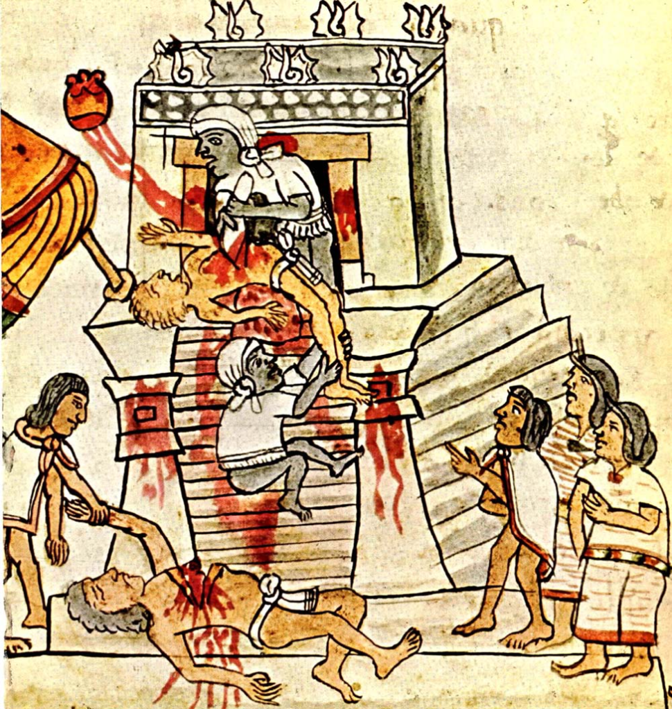 Aztec human sacrifice as shown in the Codex Magliabechiano, Folio 70, page 141.  No, this is not a depiction of an archaeology dissertation defense, although it does feel like one.